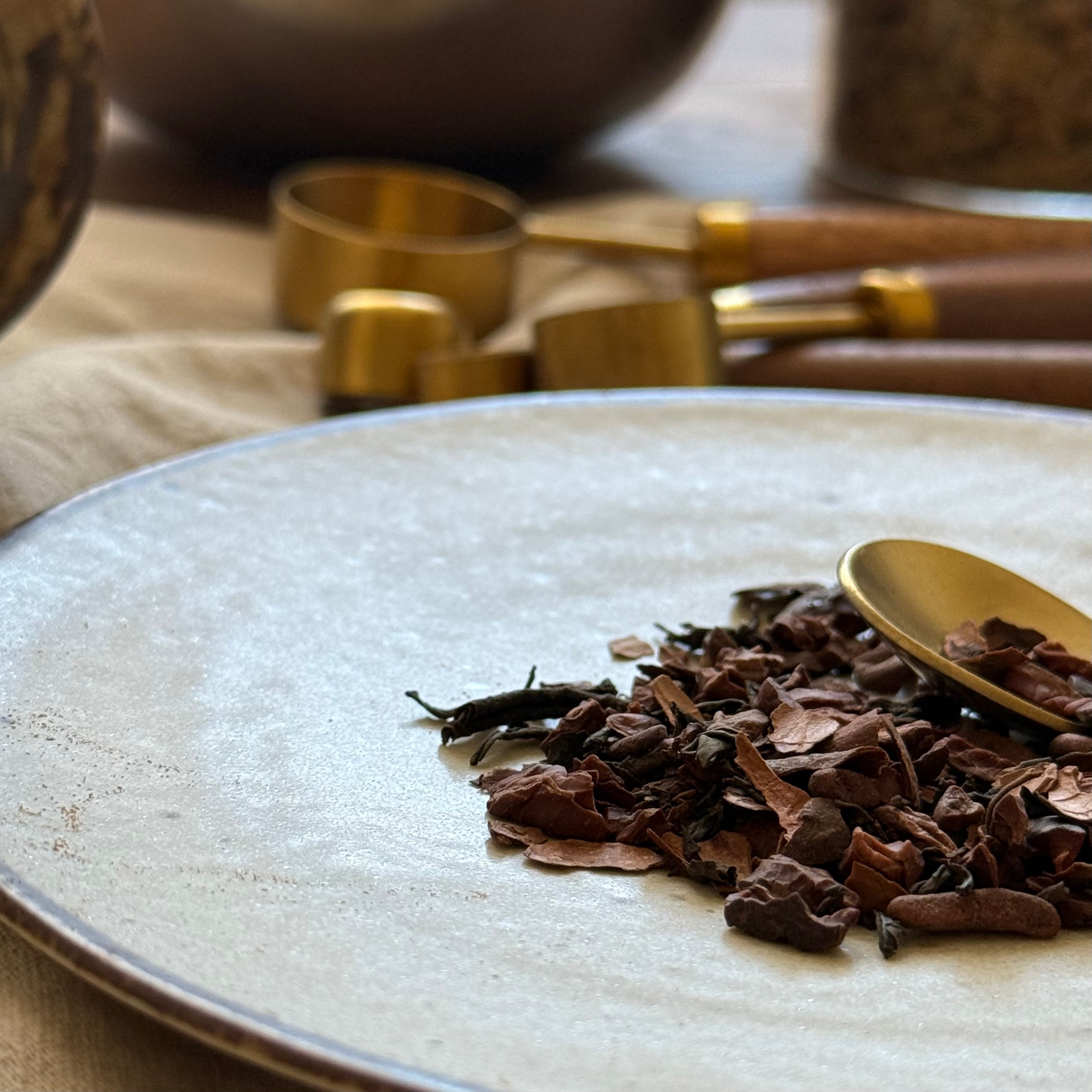 苦味や渋みの少ない和紅茶にカカオハスクやカカオニブを加えました。